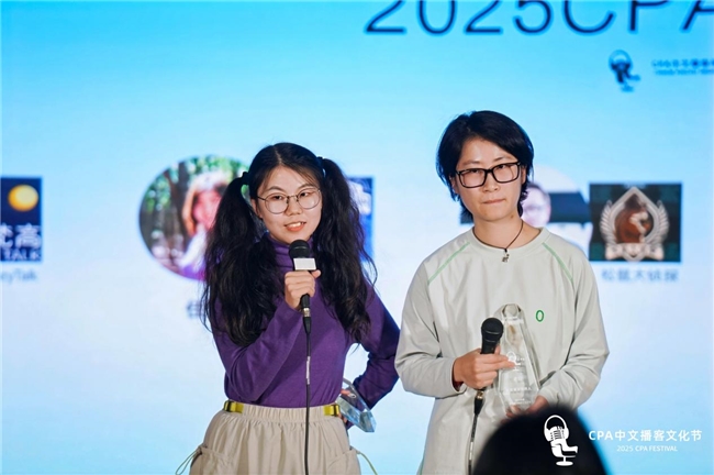 图为机构制作人获奖代表,播客《岩中花述》制作人Kass和阿星(JustPod)在现场发言