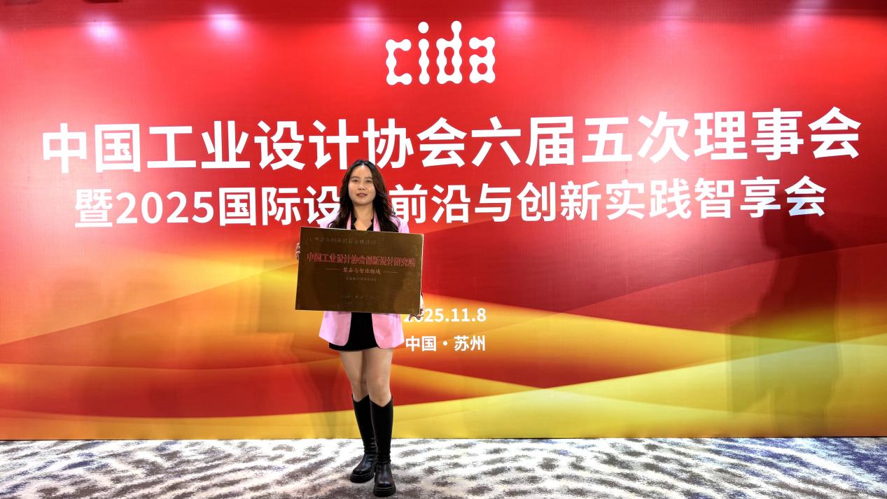 图摄于中国工业设计协会六届五次理事会颁奖现场,深圳智加装备事业部总经理熊艳领奖。
