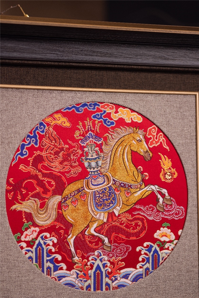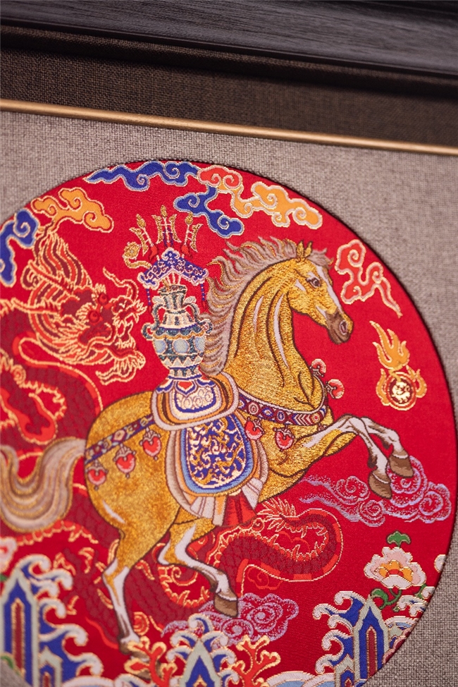 马首昂扬望向远方,脚踏祥云及海浪奔腾而至;龙身盘旋如飞,与五彩祥云相呼应,表达出中华民族的龙马精神。画面中央,金色宝马昂首伫立,前蹄轻扬,生动诠释积极向上、奋勇开拓的精神为体现“骏业腾飞”的主题。画面中还融入了宝瓶、戟、牡丹等传统吉祥元素,既保留了云锦“寸锦寸金”的华贵气质,又通过动态线条传递出蓬勃向上的时代精神。