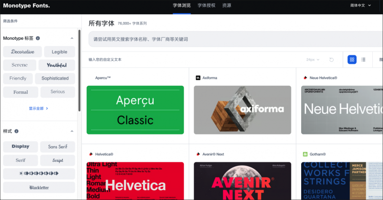 Monotype Fonts 中文平台深度融合蒙纳全球字体资源与中国用户的实际需求,汇集超过 27万款正版字体,覆盖550种语言,包括 Helvetica®、Avenir®、Gotham®、蒙纳盈黑等广受全球品牌青睐的经典与新兴字体家族。