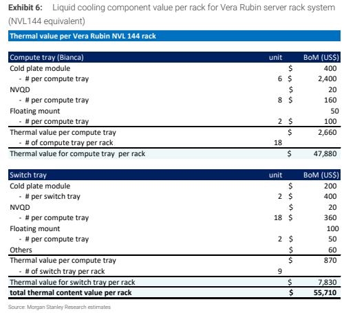 摩根士丹利相关分析师从产业机遇角度补充:“Rubin平台散热方案升级将带动液冷核心组件需求爆发,其中下一代Vera Rubin NVL144平台预计单个机柜的冷却组件总价值将达到5.57万美元,这一数值较上一代GB300平台增长17%。具备精密加工能力和全栈解决方案能力的液冷供应商将迎来显著市场机遇。”