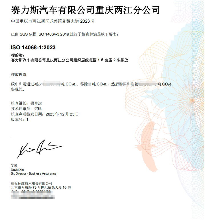 近日,赛力斯超级工厂(龙兴)通过国际权威认证机构SGS的严格审核,正式获得碳中和标准ISO14068-1:2023认证,这不仅标志着赛力斯在绿色智造的实践获得国际权威认可,更为行业可持续发展提供了可复制、可推广的方案。