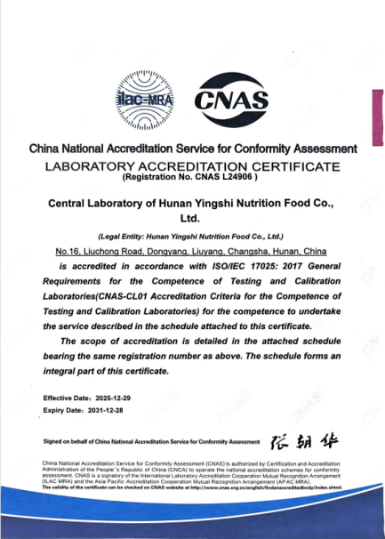 近日,英氏控股旗下湖南英氏营养食品有限公司的中心实验室正式通过中国合格评定国家认可委员会(CNAS)的严格评审,成功获得CNAS认可证书(注册号:CNAS L24906)。这是英氏控股再次获得CNAS的权威认可,背后是英氏控股从管理体系到技术细节的层层打磨,最终凭借扎实的硬实力,跻身国家认可的实验室行列,这标志着英氏中心实验多方面能力均已达到国际认可标准,也标志着英氏的科研与品控水平迈上新台阶。