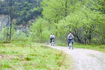 两位游客在景区内悠闲地骑着共享单车,享受大自然之美 记者 张 镇 摄