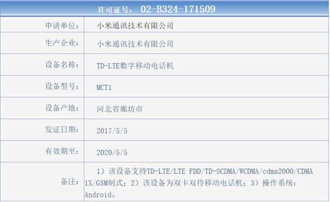 腾讯数码讯(水蓝)虽然小米6传出关键元器件良率偏低影响出货的消息,但小米却似乎有着为该机推出移动定制版本的计划。日前,来自工信部公布的信息显示,小米旗下已经又一款型号为MCT1的新机获得了入网许可证,并且从放出的证件照和相关参数来看,应该是小米6的移动版本,预计有可能在6月份左右与我们见面。