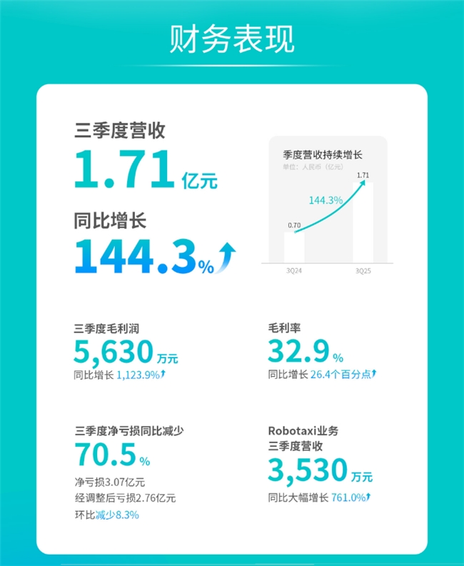 11 月 24 日,全球领先的自动驾驶科技公司文远知行发布2025年第三季度财报,多项核心财务指标呈现爆发式增长与亏损收窄的双重向好态势。财报显示,三季度公司实现营收1.71亿元,同比大幅增长144.3%,创下成立以来季度涨幅新高;其中Robotaxi业务营收达3530万元,同比激增761.0%,延续强劲增长势头,成为拉动整体营收的核心引擎。