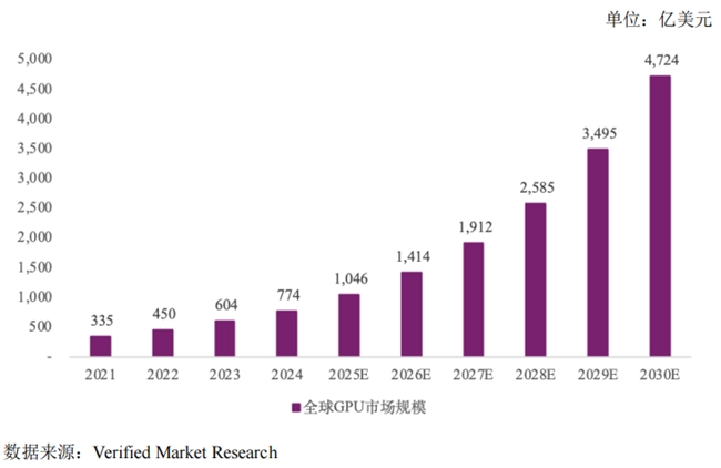 全球 GPU 市场正处于爆发期,Verified Market Research数据显示,2024年全球GPU市场规模为773.9亿美元,预计2030年将飙升至4724.5亿美元,2024-2030年复合增长率高达35.19%。