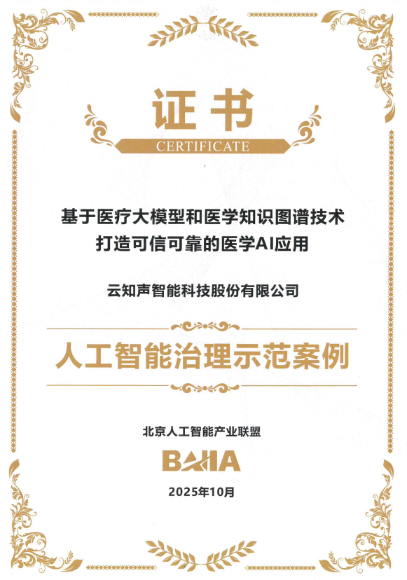 2025年6月30日,云知声(09678.HK)成功登陆港交所,以“港股AGI第一股”的身份开启资本市场新征程,持续获得资本市场对其AGI产业化价值的高度认可。而在行业领域,其技术实力与治理实践再获权威背书,在《2025国际前瞻人工智能安全与治理大会(FAISG2025)》中,云知声“基于医疗大模型和医学知识图谱技术打造可信可靠的医学AI应用”成功入选《北京人工智能治理案例集》,斩获“人工智能治理示范案例”称号,双重认可彰显其在智慧医疗领域的深厚积淀与领先地位。