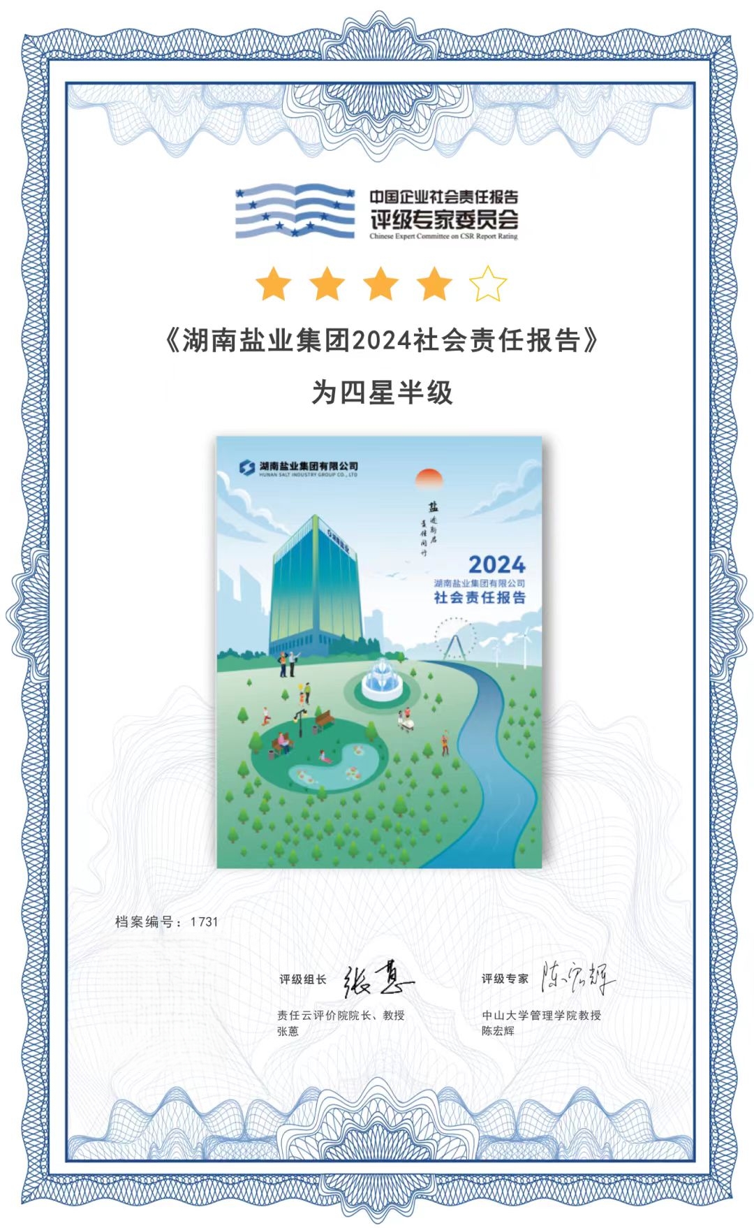 11月20日,由中国企业改革与发展研究会、责任云研究院主办的ESG中国·第八届北京责任展在京开幕,活动发布了2025年“责任鲸牛奖”榜单。湖南盐业集团荣获责任新秀奖,此外,湖南盐业集团2024年度可持续发展报告首次参与评级便获得四星半(领先级)评价,入选活动中发布的《企业社会责任蓝皮书(2025)》,体现出可持续信息披露的较高水准。