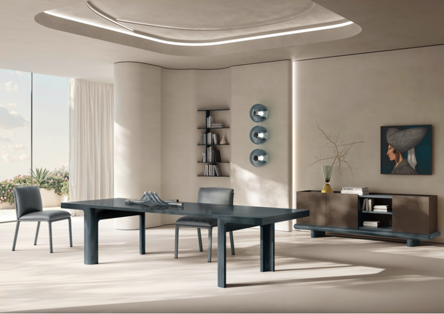 这种设计理念也延伸至同系列的客厅与餐厅家具。餐桌以其精炼严谨的设计,脱颖而出成为一件精致且多功能的单品。同属客厅区域的边柜,通过将圆润有机的底座与线条利落严谨的储物柜体相结合,强化了现代感与功能性,营造出优雅而温馨的氛围。