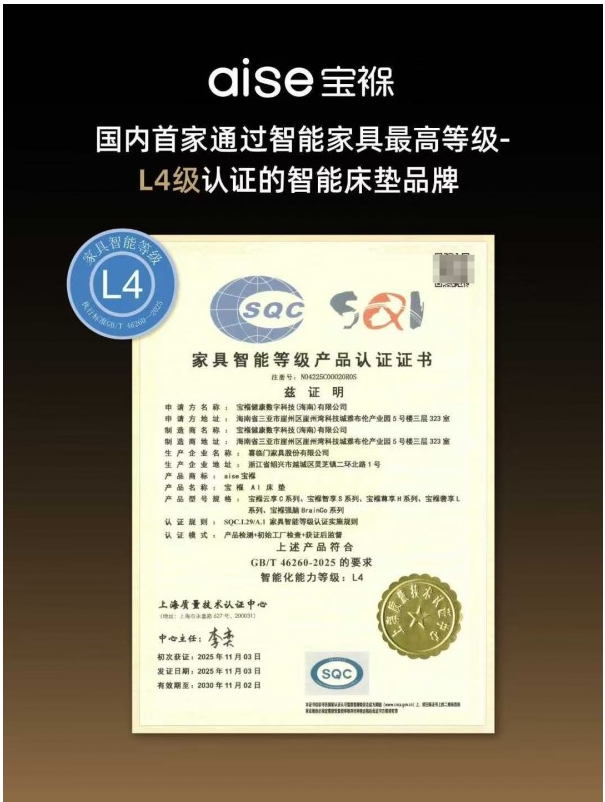 近期,该品牌率先通过《家具 智能等级评定及标识》(GB/T46260—2025)国家标准,其云享C、智享S、尊享H等五大系列均获得L4级智能标准认证,代表了目前国内床垫领域智能化的最高水平。