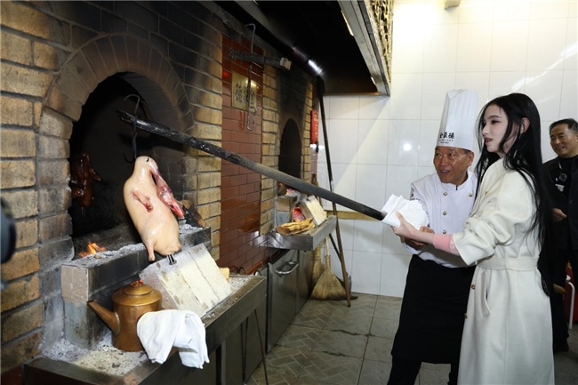 在全聚德的烤鸭间里,非遗传承人手持鸭杆,向玛丽亚演示着非遗技艺。鸭杆轻轻一挑,肥美的鸭坯在空中划出弧线,稳稳飞入炉火正旺的鸭炉。这一传承了160多年的动作,如今通过特约体验官的亲身体验,正在向全世界进行传播。