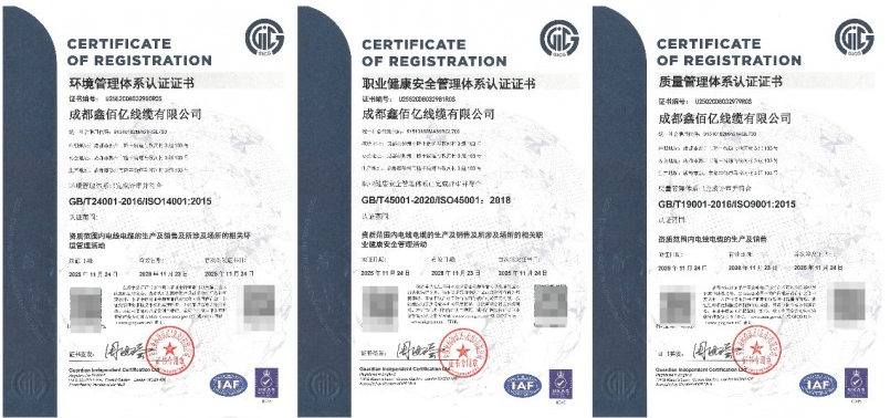 成都鑫佰亿线缆有限公司深耕电线电缆制造领域,通过环境管理体系(GB/T24001-2016/ISO14001:2015)、职业健康安全管理体系(GB/T45001-2020/ISO45001:2018)、质量管理体系(GB/T19001-2016/ISO9001:2015)三项权威体系认证,认证覆盖企业资质范围内电线电缆的生产、销售及全流程管理活动,标志着其在质量管控、绿色生产、员工安全等维度的管理能力全面接轨国际规范。