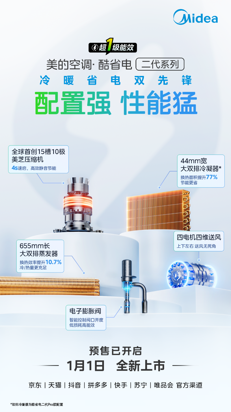 据悉,美的空调·酷省电二代已在京东、天猫、抖音、拼多多等官方渠道同步开启预售,并将于1月1日正式发售。预售期间,付定下单即可享101元专属优惠,购买第二套还能再享8折优惠,优惠多多,不容错过!