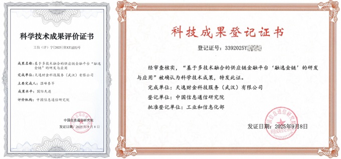 2025年9月,天逸集团荣获工信部“国际先进科技成果”国家级权威认证,这标志着集团在供应链金融科技研发与应用方面达到国际先进水平。