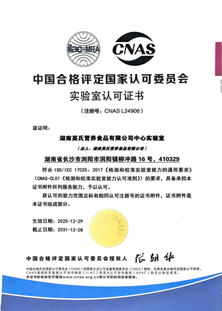 近日,英氏控股旗下湖南英氏营养食品有限公司的中心实验室正式通过中国合格评定国家认可委员会(CNAS)的严格评审,成功获得CNAS认可证书(注册号:CNAS L24906)。这是英氏控股再次获得CNAS的权威认可,背后是英氏控股从管理体系到技术细节的层层打磨,最终凭借扎实的硬实力,跻身国家认可的实验室行列,这标志着英氏中心实验多方面能力均已达到国际认可标准,也标志着英氏的科研与品控水平迈上新台阶。