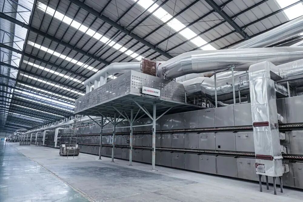 这一战略布局的典型体现,是将军肇庆基地2021年率先引进两条双层窑进行岩板生产。这并非简单的设备更新。而是对品质升级的一次前沿探索。双层窑将四条传统生产线的产能浓缩于两条,这相当于用同样的用工人数和土地占用创造了双倍的产出,其带来的直接效益是单位能耗的显著下降与人均产值的大幅跃升。据介绍,当前两条双层窑生产人员总数不到200人,相比传统生产线优势极为明显。