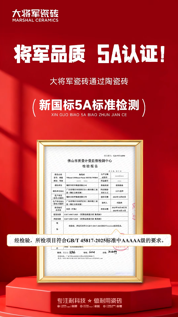 随着消费升级与信息平权,终端用户对瓷砖的认知日趋完善与专业。将军陶瓷集团大胆直面这股品质透明化趋势,将2025年12月正式实施的新国标《消费品质量分级 陶瓷砖》(以下简称“5A标准”)视为提升品牌信任的战略机遇。