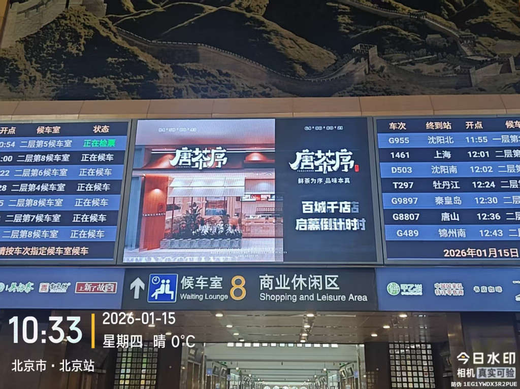 作为立足西湖的茶饮品牌,唐茶序深耕“原叶鲜茶+国风美学”核心赛道,传承汉唐制茶技艺精髓,严选当季原叶与鲜醇奶源,打造健康无添加的新中式茶饮,其茶底的清冽回甘与鲜奶的醇厚绵密相得益彰,尽显东方茶饮的匠心底蕴。此次登陆的北京火车站候车厅大屏,覆盖进站、候车、检票全动线核心区域,日均触达数十万高净值客流,涵盖商务精英、旅游人群及跨城消费者等核心客群,旅客平均停留时长超20分钟,广告记忆度高达85%以上。