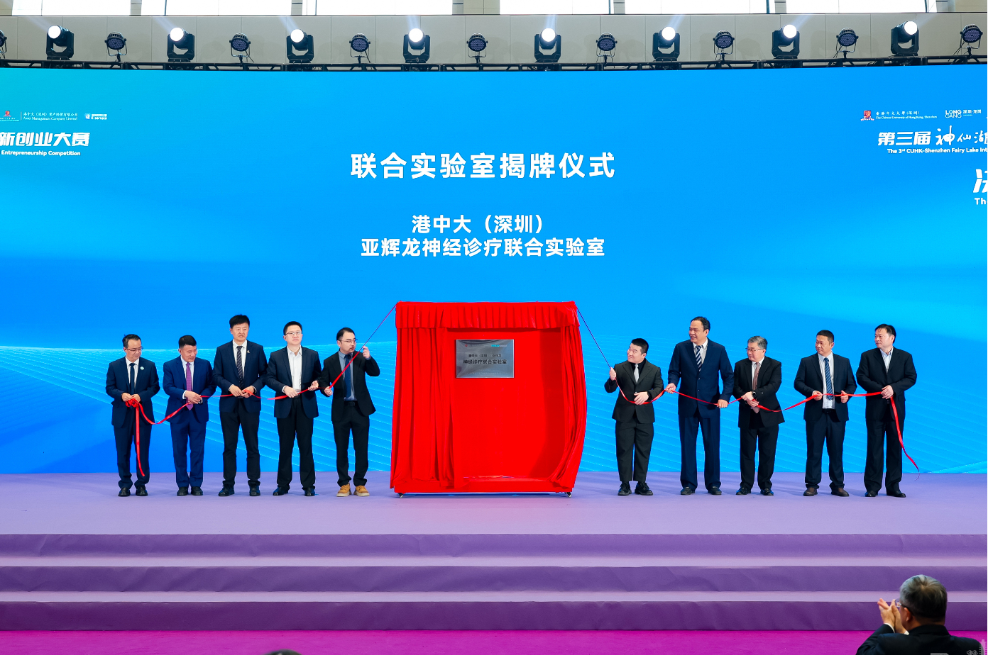 当天上午,在香港中文大学(深圳)举办的第三届“神仙湖”国际创新创业大赛活动现场,港中大(深圳)与亚辉龙共建的“神经诊疗联合实验室”正式揭牌。港中大(深圳)党委书记李学金、龙岗区副区长丁正红等政府与校方代表,以及亚辉龙创始人胡德明、董事长兼CEO胡鹍辉等企业高管共同为实验室揭牌。