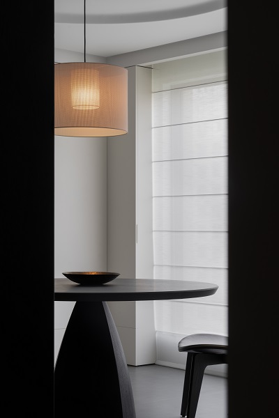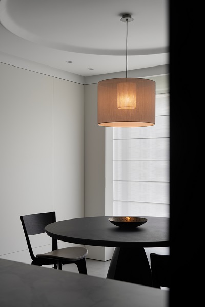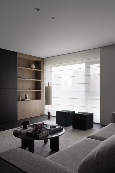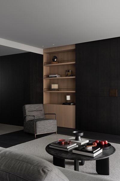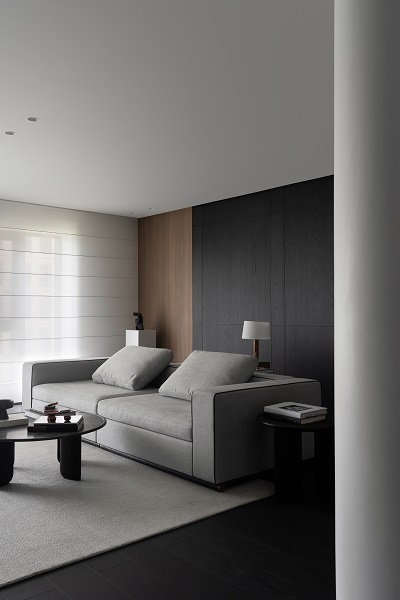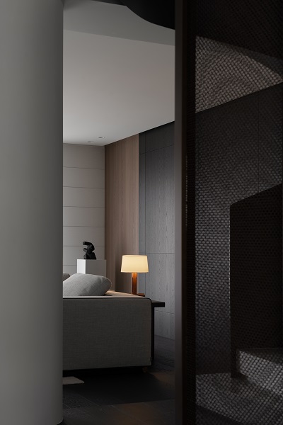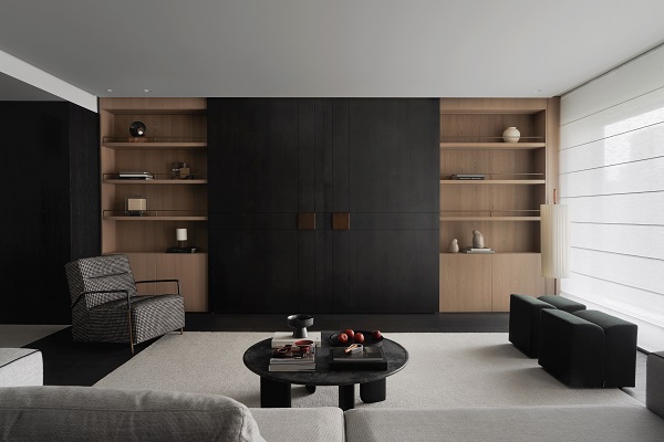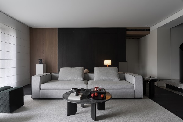 不尔设计与班兰在此案中达成了一种默契的共筑:设计从解构空间出发,奠定现代东方的骨架与气韵;而班兰的家具则以器物之美——从客厅的沉香沙发、海棠几,到卧室的卧云床,餐厅的磐木餐桌——注入了温度、质感与持久的生活智慧。它们不仅是功能物件,更是空间叙事的一部分,共同写下一首黑白灰的诗,安静、包容、充满巧思,等待时间与生活为其填充色彩。