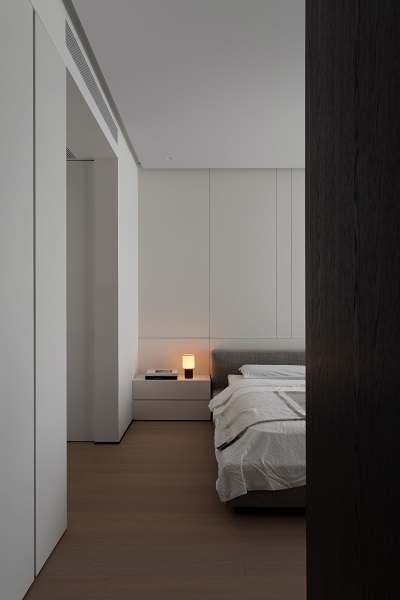 静谧卧房,云端安眠:主卧室选用班兰的卧云床,其宽厚稳重的床头靠背与悬浮般的视觉设计,在黑白灰的卧室中营造出如卧云端的包裹感与安全感,为主人提供极致的放松体验。