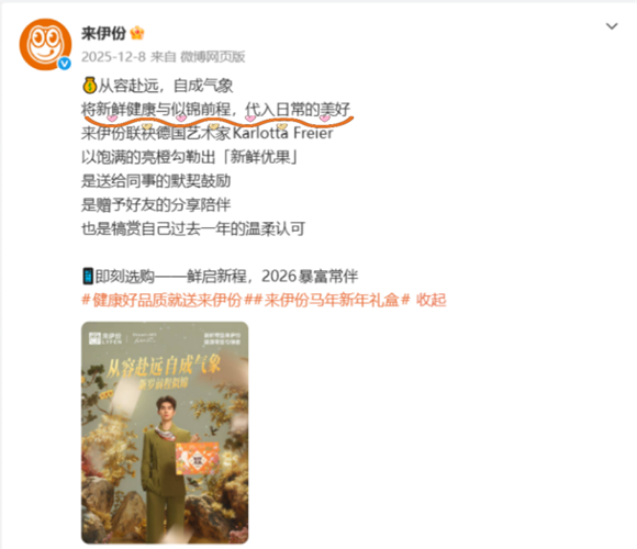 为精准触达年轻客群,来伊份今年联合青年演员、歌手文俊辉,共同推荐“新鲜优果”“优果世界风”等一系列新春礼盒。礼盒不仅融合“福禄双全”“好运连连”等传统吉祥话,更坚持“五低一洁”(低糖、低脂、低卡、低盐、低GI,清洁配方)健康标准,严选云南纸皮核桃、减糖芒果干等优质原料。文俊辉阳光活力的公众形象与品牌“新鲜、品质”理念高度契合,为产品注入了情感溢价与社交分享动能。