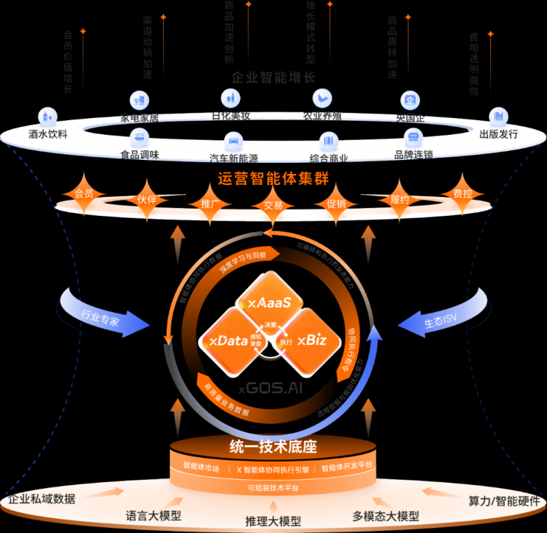 我们深度融合10年行业沉淀与前沿AI能力,率先打造「xGOS.AI」企业运营超级智能体,覆盖“营销-订单-供应链-业财”全链路,为企业交付可自主驱动业务的“数智运营团队”。xGOS.AI,作为“企业智能体的总管家”,具备“感知-决策-执行-反馈”的智能运营能力,其独创的 “一体两翼”架构——以xAaaS智能体运营平台为“大脑”,以xBiz业务智能平台和xData数据智能平台为“两翼”,三者之间构成紧密的数据智能与业务价值“双向驱动”闭环,通过产品、解决方案以及生态体系“三线齐飞”,共同作用于企业运营,赋能企业营收增长、效率提升与成本优化,驱动可预测、可监控、可衡量的业务成果实现。