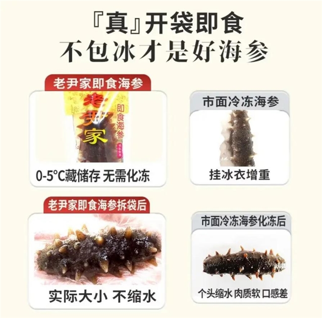 作为青岛当地海参龙头企业,老尹家海参深耕海产品养殖行业20余年,其即食海参来自国家级海洋牧场,通过创新工艺多重锁鲜,最大程度保留营养成分,且不含任何添加剂,保障原汁原味、正宗地道。与市面上的冷冻海参相比,老尹家的特色水袋装海参食用方便,无需化冻后加热,撕开袋子就可以直接吃,且个头不缩水,口感鲜美有嚼劲。