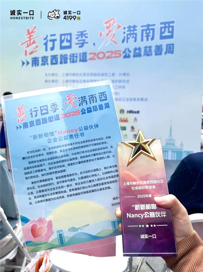 9月4日,南京西路街道2025公益慈善周活动在吴江路四季坊中庭顺利开启。本届活动以“善行四季 爱满南西”为主题,旨在表彰优秀公益伙伴,推动社区公益生态链可持续发展。国产宠粮品牌诚实一口受邀参加,并被授予“新新相惜”Nancy公益伙伴称号。