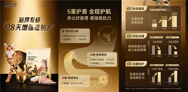 根据2025年最新市场调研和消费者口碑,国产猫粮品牌“诚实一口”凭借扎实的用料、创新的工艺赢得消费者信赖,其旗下全系列猫粮,在幼年成长、季节性喂养、日常喂养、特殊需求和营养补充等多个使用场景下都提供了针对宠物不同需求的产品。“诚实一口”黑金烘焙猫粮。该款专为呵护猫咪肠胃研发,添加多种优质成分形成“五重消化护盾”,28天可显著增强猫咪抵抗力。其由“诚实一口”自有启鲜工厂生产,采用无人智能产线、真空烘焙专利及“0辐照”技术,严格遵循十大旗舰标准,经央视《超级工厂》实地探访见证,从源头保障产品新鲜与品质。