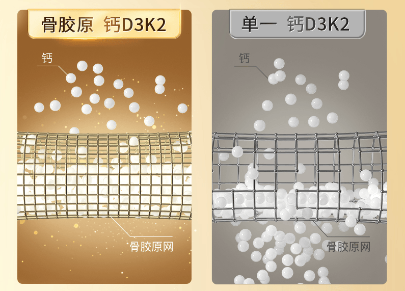 骨骼是由有机化合物“骨胶原”和无机化合物磷酸钙组成,西北工业大学生命学院杨鹏飞副教授团队研究发现,补钙不等于补骨,钙的主要作用是增加骨骼硬度,而骨胶原构成的质密网状结构,可以将沉积的钙质牢牢固定在骨骼结构内,减少钙质流失或异常沉积。若长期只补钙而忽略骨胶原,钙的利用和留存会受限,导致补钙效果不佳,盲目补钙还可能导致因钙沉积引发肾结石的健康风险。