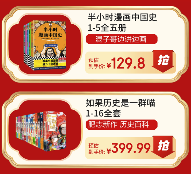 漫画书可以帮助孩子建立阅读信心,假期正是他们巩固知识、拓展视野的宝贵时机。《半小时漫画中国史1-5》全五册,以生动有趣的漫画形式,系统梳理中华五千年历史脉络,从夏商周到明清,重要历史事件化为一个个鲜活易懂的场景,活动预估到手价129.8元。《如果历史是一群喵1-16》全套则以可爱的喵星人全新演绎历史故事,让孩子在趣味中轻松学习,了解中华文明进程,激发对传统文化的兴趣,活动到手价399.99元。这两套集趣味与知识于一体的历史漫画,既能点燃学习热情,也能夯实人文底蕴,无论是课外阅读还是配合课内学习,都是绝佳助力。
