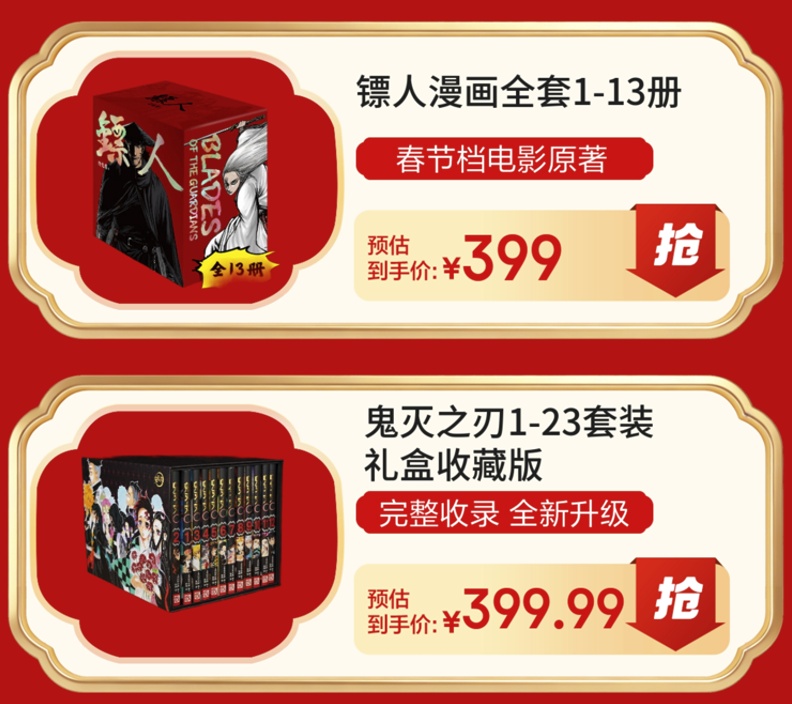 新年假期,也是沉浸式感受热血魅力、解锁硬核战斗美学的美好时刻。《镖人漫画全套1-13册》,以凌厉笔触勾勒隋末江湖的侠义豪情,刀光剑影间,每一次对决都成为震撼的视觉场景,将侠客的快意恩仇展现得淋漓尽致,活动预估到手价399元。《鬼灭之刃1-23》套装礼盒收藏版则以细腻画风描绘斩鬼路上的羁绊与坚守,让热血与温情交织成动人篇章,活动期间399.99元可以入手。