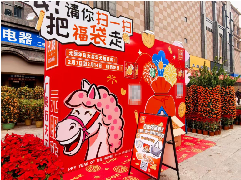 打卡区内,元朗食品精心设计的福位座椅 “一坐福禄旺、二坐岁岁康、三坐姻缘撞” 的马年祝福,紧扣广东春节的祈福传统,让消费者在打卡互动中收获满满年味。市民只需落座福位拍照打卡,扫码即可领取元朗定制福袋。