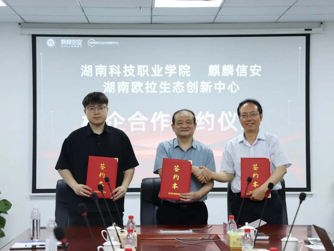 湖南科技职业学院校长蒋阳飞、麒麟信安副总裁王忠锋以及湖南欧拉生态创新中心副主任刘华杰代表三方签署了《校企合作框架协议》。三方将在人才培养、课程开发、实训基地共建等领域达成深度合作,共同探索数字经济背景下高素质技术技能型人才的培养新模式。