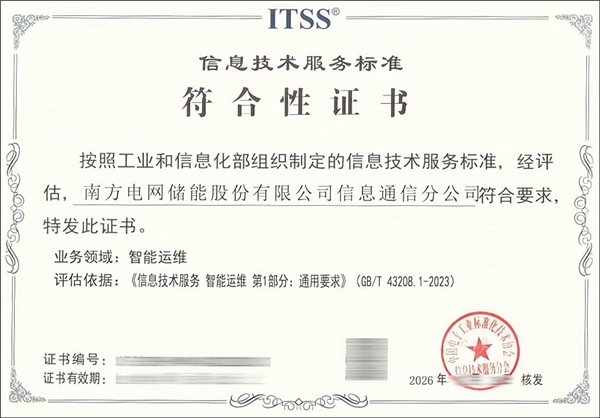 作为南方电网储能股份有限公司(以下简称“南网储能”) IT 服务运维核心支撑力量,南网储能股份有限公司信息通信分公司(以下简称“南网储能信通公司”),近期顺利通过ITSS智能运维权威评估,荣获由中国电子工业标准化技术协会信息技术服务分会颁发的《信息技术服务标准(ITSS)智能运维证书》!这一国家级高阶认证为 IT 服务领域权威标杆,国内获证企业仅十余家,南网储能信通公司更是南方电网集团首家获此殊荣的单位,标志着其智能运维能力跻身国家级顶尖梯队,信通运维服务全面接轨国家最高标准,为储能业务高质量发展筑牢坚实数字底座。
