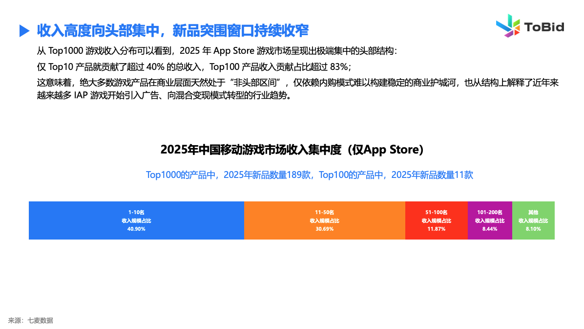 从供给侧来看,游戏行业仍处于高密度竞争状态。2025年App Store新上架游戏数量超过4.6万款,仅上半年上线产品即超过2万款,供给端的持续扩张并未放缓。但商业结果却呈现出明显分化,收入高度集中于极少数头部产品,Top10与Top100产品贡献了绝大部分市场收入。