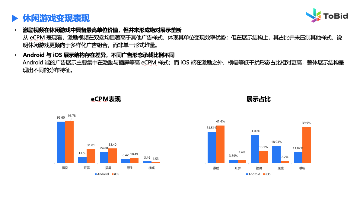 休闲游戏中,激励视频展示没有形成压倒性优势,双端出现结构分化。iOS端横幅展示占比接近四成。Android端的插屏展示则大幅领先,占比超过30%。