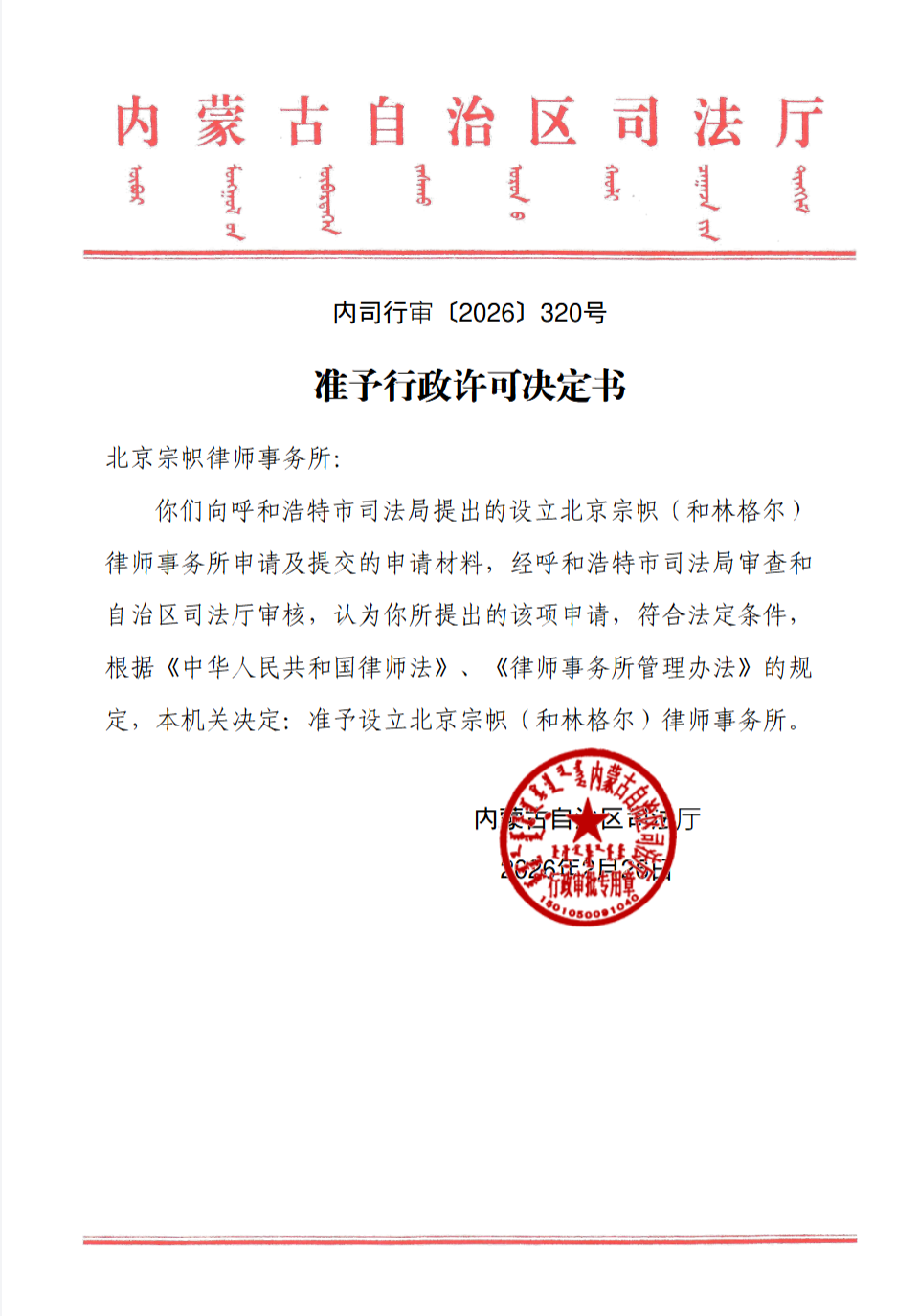 近日,内蒙古自治区司法厅正式作出行政许可决定(内司行审〔2026〕320 号),准予设立北京宗帜(和林格尔)律师事务所。这一审批结果,既是对北京宗帜律师事务所专业实力与行业积淀的认可,更是宗帜律所布局北疆法律服务市场、助力内蒙古数字经济与法治建设深度融合的重要里程碑,标志着宗帜律所在跨区域法律服务体系建设上迈出关键一步。