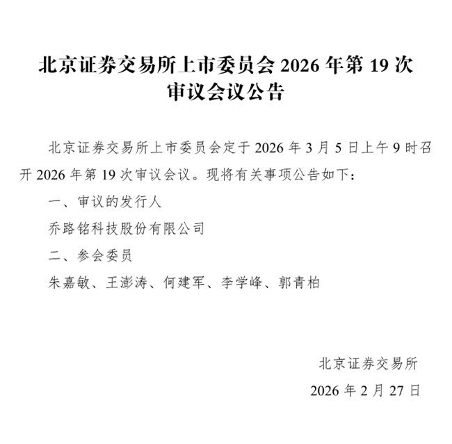A股资本市场迎来新动态。2月27日,北交所官网发布公告显示,拟于3月5日对乔路铭科技股份有限公司(简称“乔路铭”)的发行上市申请进行审议。