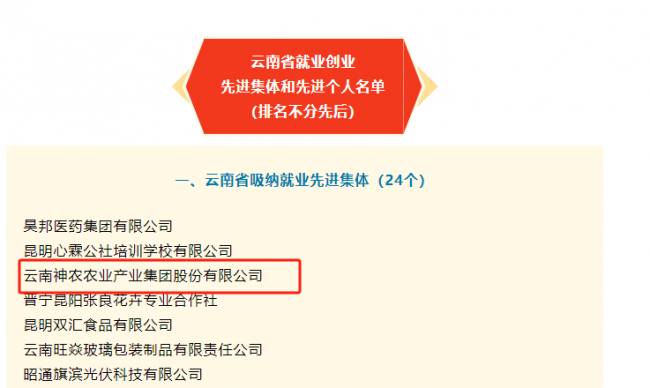图 1:神农集团上榜云南省吸纳就业先进集体名单