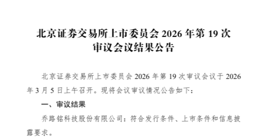 3月5日晚间,北交所上市委发布2026年第19次审议会议结果,乔路铭科技股份有限公司(以下简称“乔路铭”或“公司”)IPO申请顺利过会。