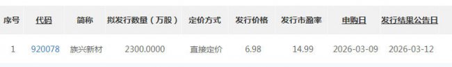 北交所网站信息显示,族兴新材本次拟公开发行新股不超过2300万股,发行价格为6.98元/股,市盈率14.99倍,股票代码为920078,预计3月12日公布发行结果。