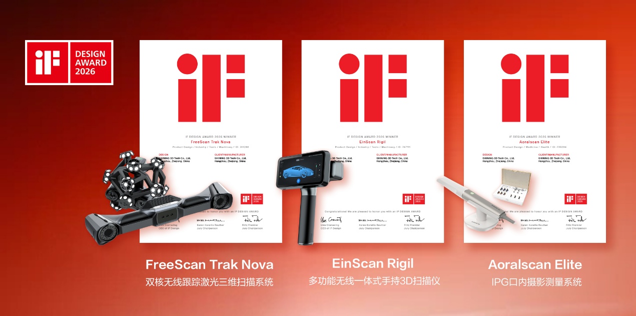近日,德国iF设计奖(iF DESIGN AWARD 2026)获奖名单正式揭晓。先临三维旗下两款工业3D扫描产品FreeScan Trak Nova双核无线跟踪激光三维扫描系统、EinScan Rigil多功能无线一体式手持3D扫描仪和一款齿科数字化产品Aoralscan Elite IPG口内摄影测量系统,分别斩获这一国际设计界的至高荣誉。