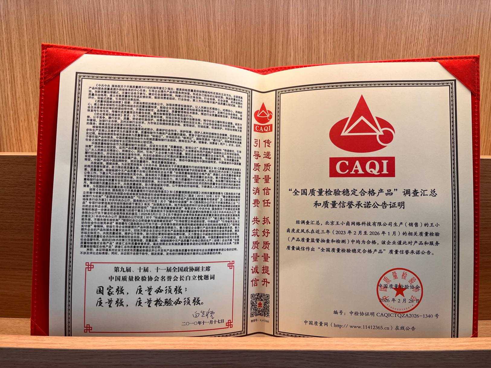 王小卤获中国质量检验协会三项权威认证