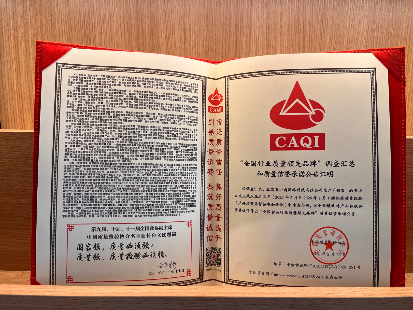 近日,中国质量检验协会正式公布“产品和服务质量诚信承诺”主题活动认证结果。卤味零食品牌王小卤凭借卓越的产品品质与行业标杆级的质量管控体系,被授予“全国食品行业质量领先品牌”“全国质量检验稳定合格产品”“全国消费者质量信誉保障产品”三项认证。