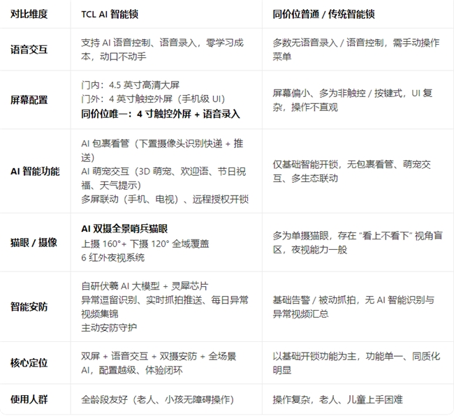 TCL AI智能锁以独家双屏语音交互、领先双摄安防与丰富AI功能,实现配置越级。从安全守护到便捷操作,再到智能交互,形成无短板的体验闭环,既印证了TCL的技术积淀,更击中家庭用户核心痛点,成为AI智能锁市场的性价比之选。