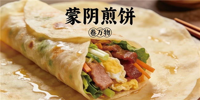 蒙阴是著名革命老区,孟良崮战役在此打响,沂蒙六姐妹拥军支前的故事深入人心。在烽火岁月里,蒙阴煎饼是支援前线的重要物资,承载着军民鱼水情深的红色记忆,是市级非物质文化遗产与地理标志美食。蒙卷万物以煎饼、卷饼为载体,深度融合孟良崮精神与沂蒙六姐妹支前精神,把红色文化、乡土情怀与现代饮食需求相结合,让一碗一饼都有故事、有温度、有情怀。