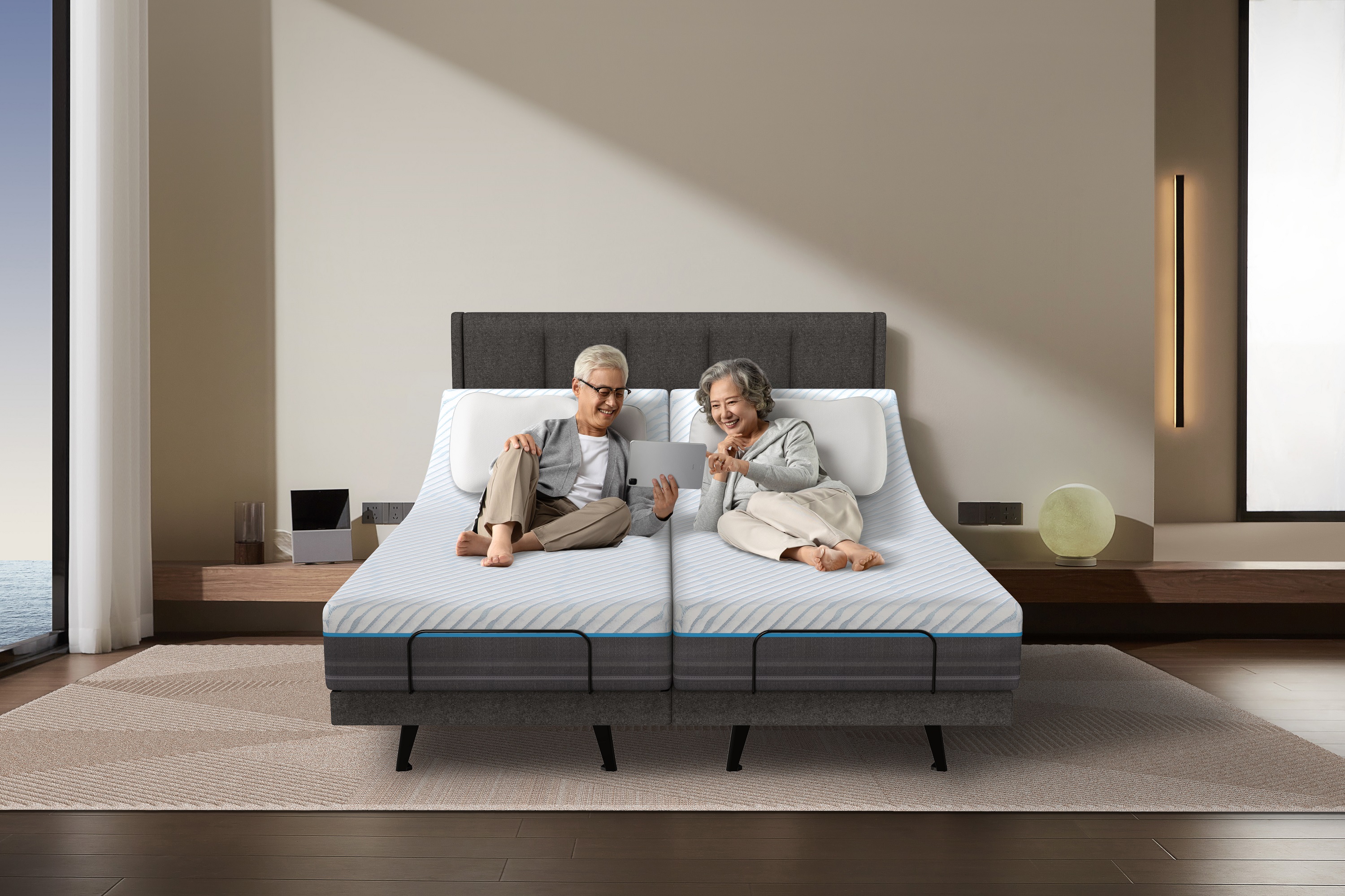 S-Senior「悦龄」适老化智能床以"3S辅具"实现物理层面的适老化关怀,以"3D预警"构建数字层面的安全守护。3S辅具中的智能护腿功能依据6项学术研究开发,可将腿部抬升至高于心脏位置,帮助血液回流,改善下肢静脉压力。